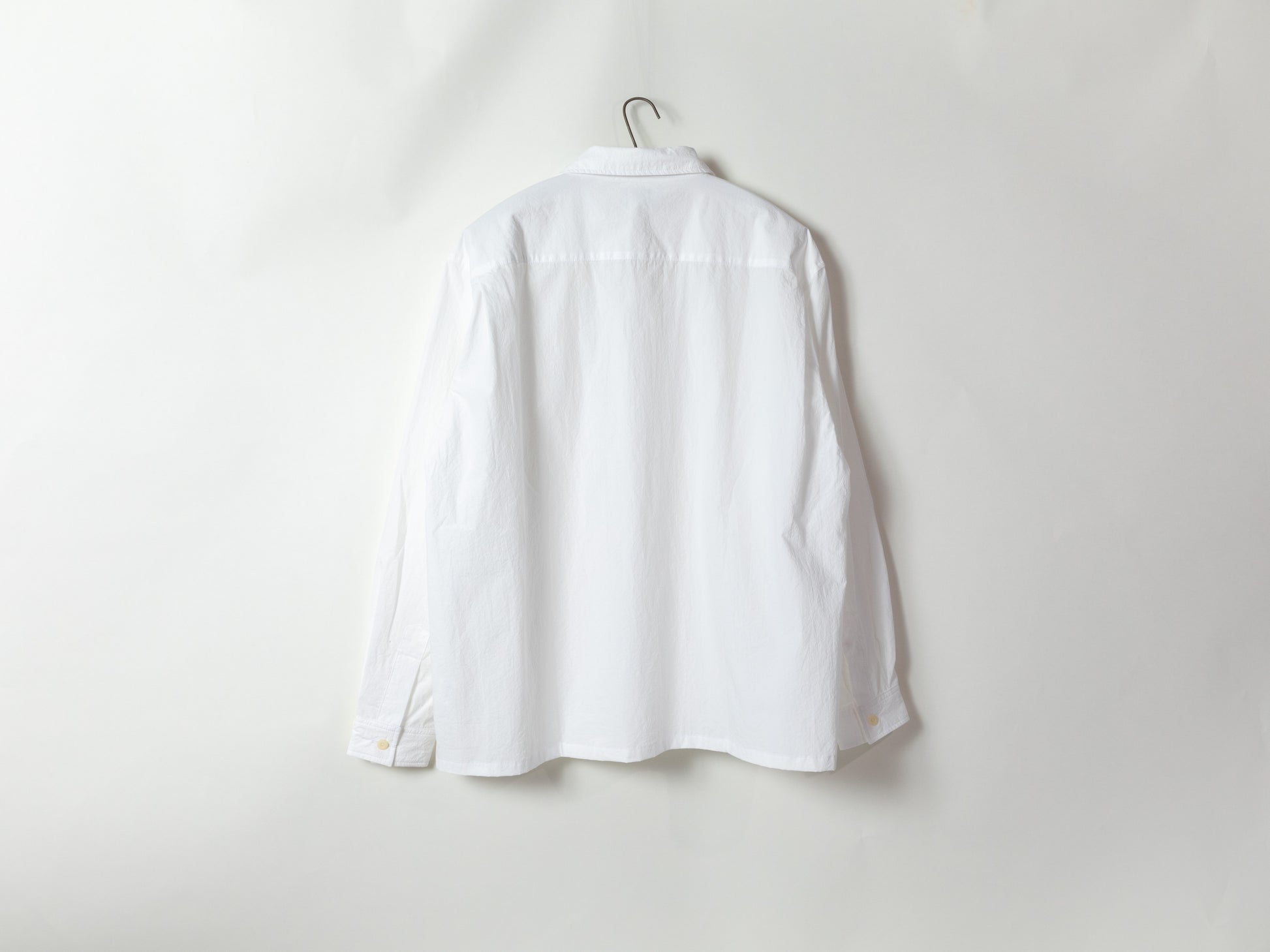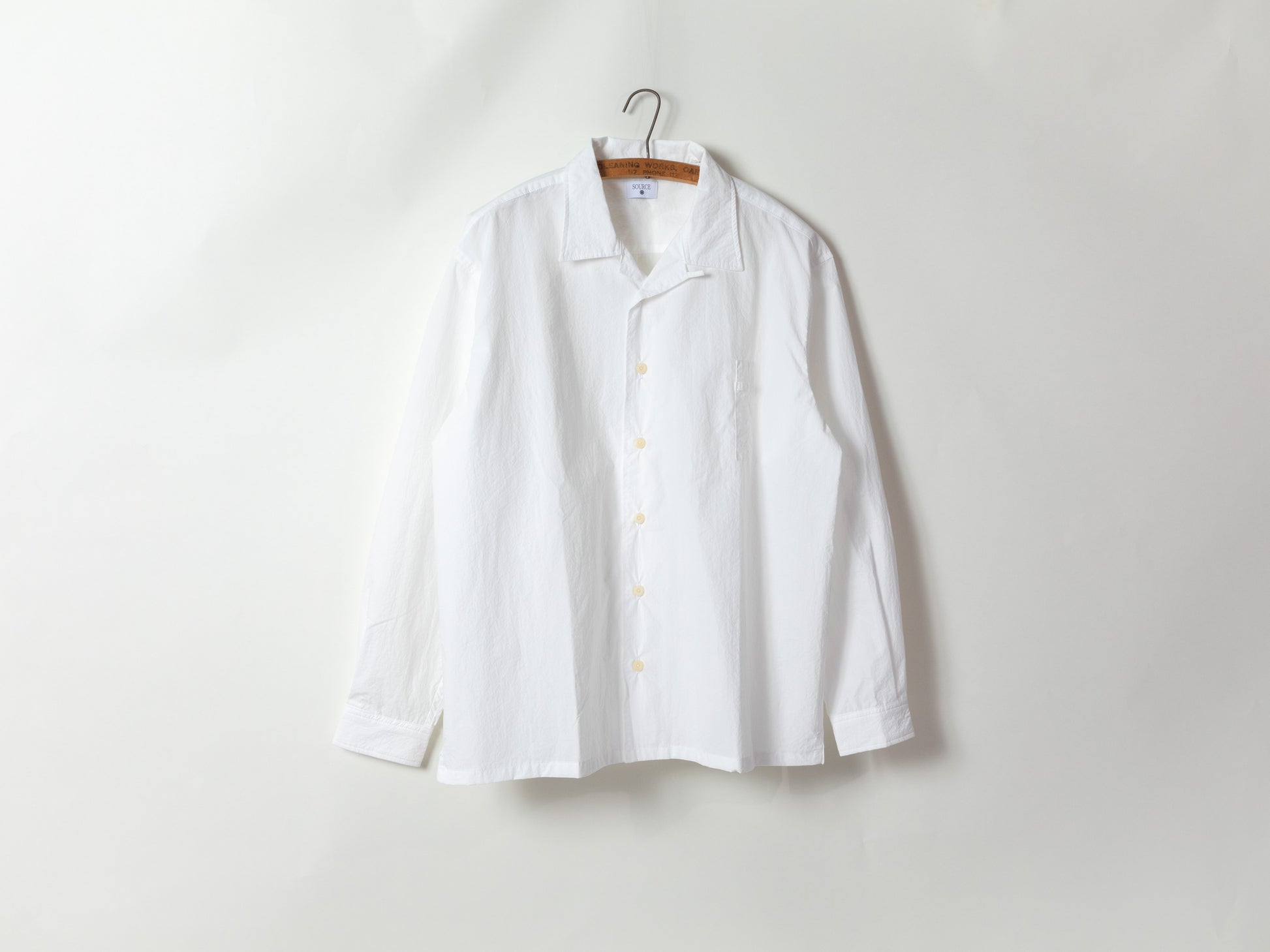 薄手のコットン100%のタイプライター生地を選定したオープンカラーのボックスシャツ。