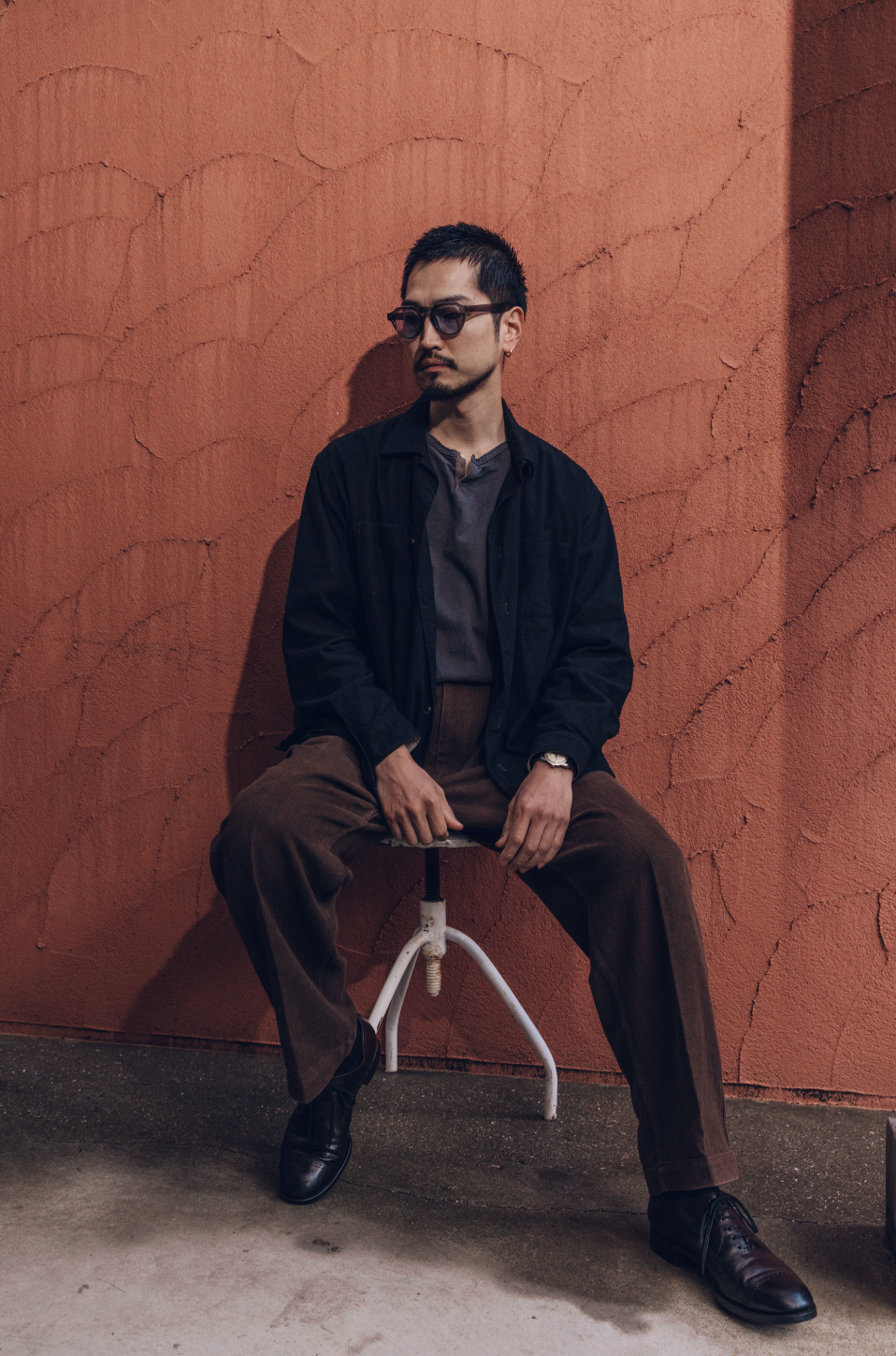 程よい身頃と丈感で絶妙なバランスのサイジング。ポケットのステッチワークやエルボパッチを裏側に当て込みシンプ